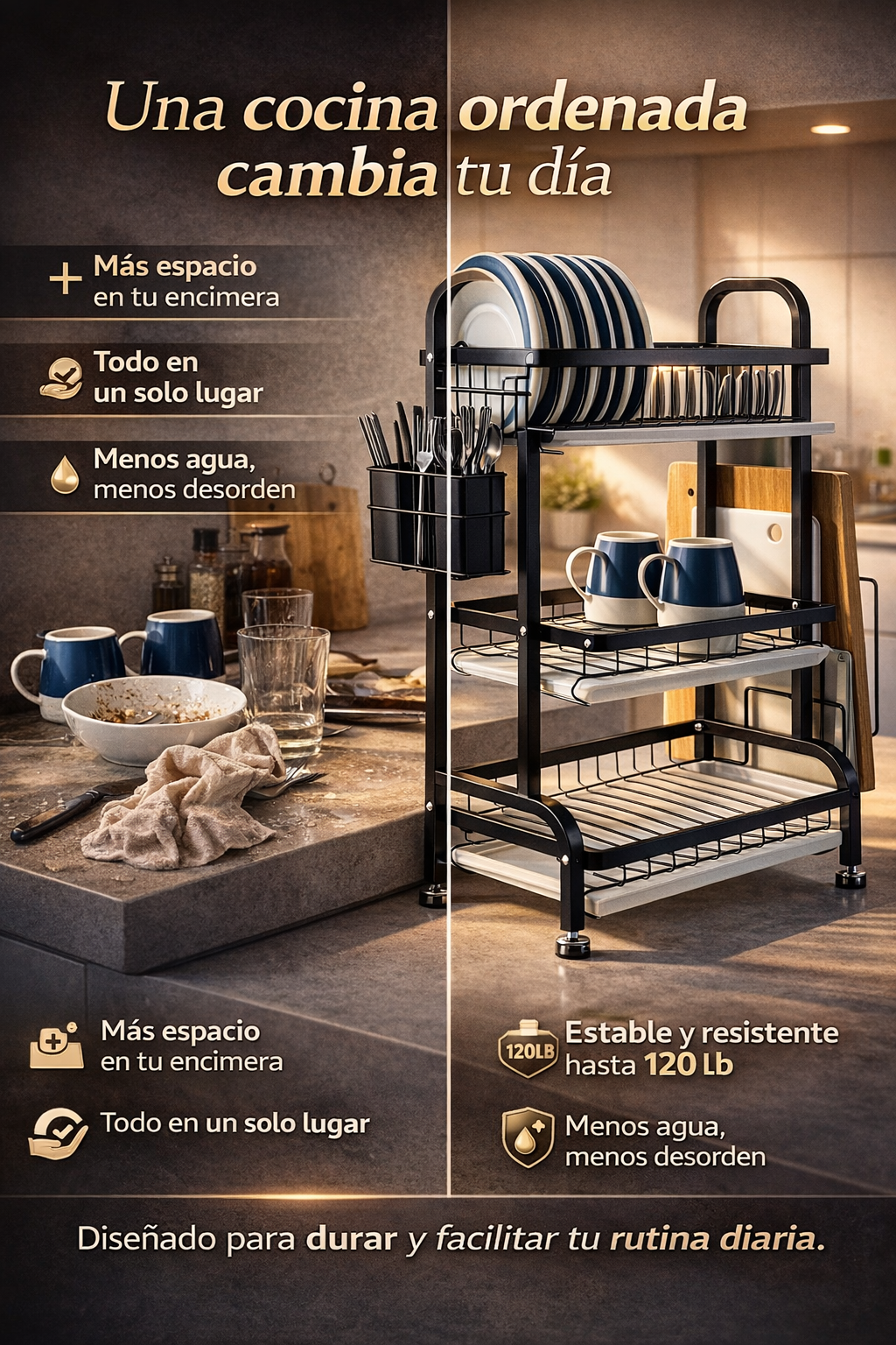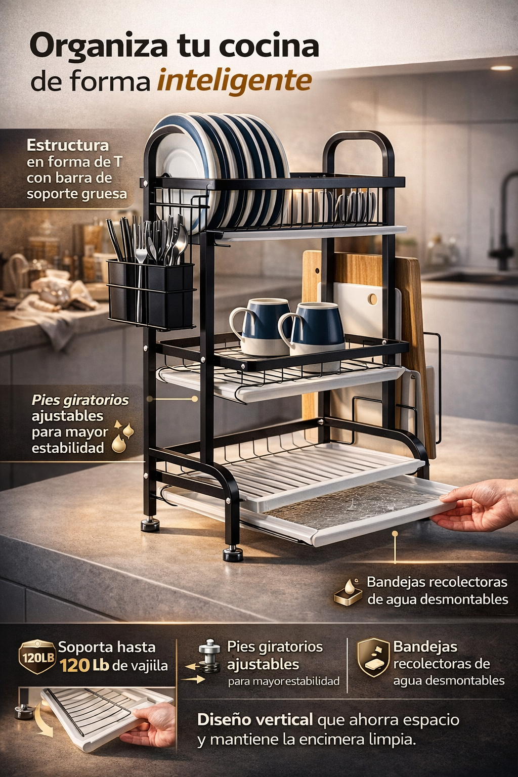 Optimiza el espacio de tu cocina con este escurridor de trastes vertical de gran capacidad, diseñado para mantener tu vajilla organizada, limpia y siempre a mano. Su estructura en forma de T reforzada brinda máxima estabilidad, mientras que su diseño vertical permite almacenar más platos ocupando menos espacio en la encimera.
