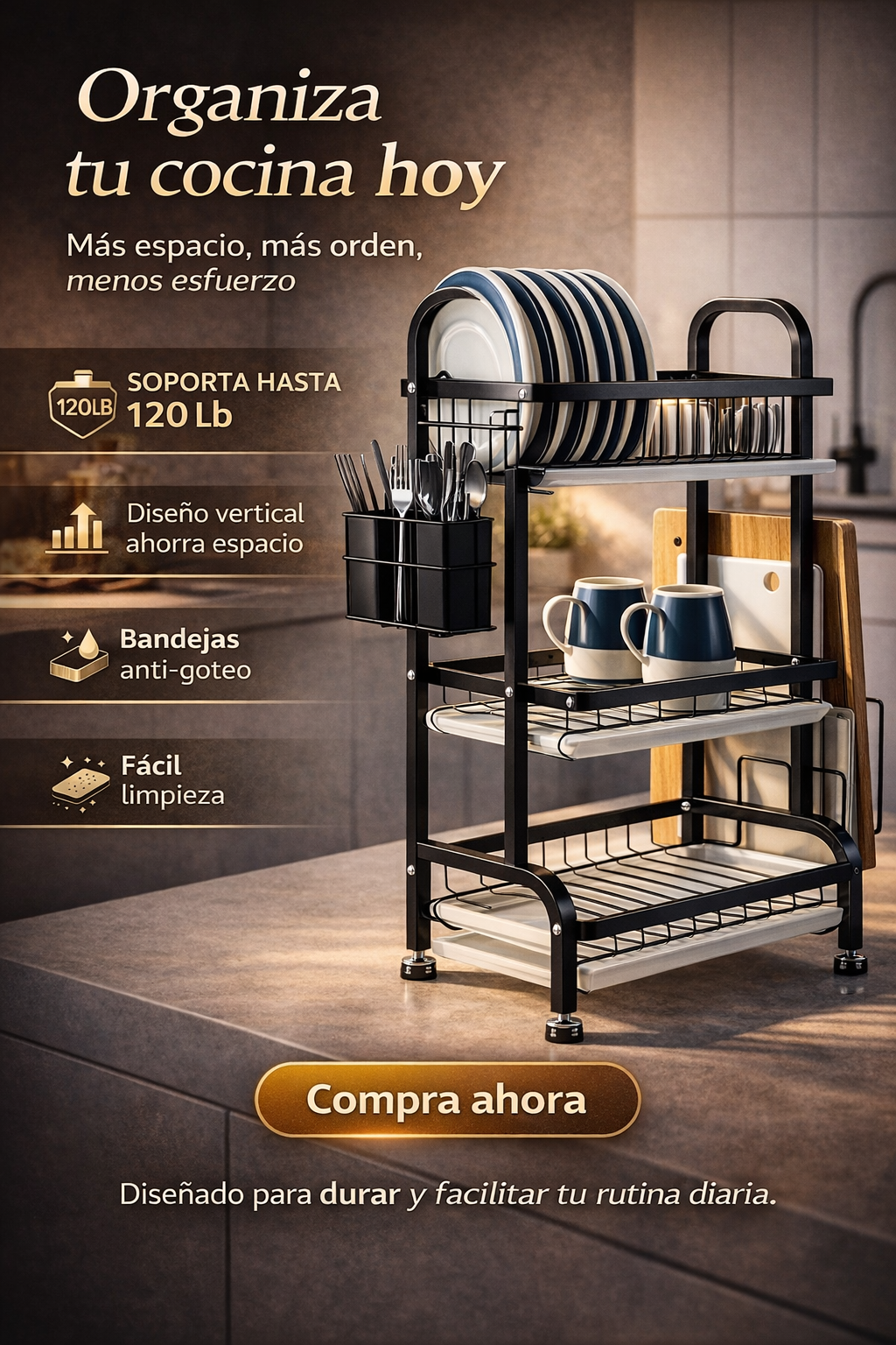 Fabricado en acero inoxidable con recubrimiento especial, combina durabilidad, resistencia y un estilo moderno ideal para cualquier cocina.